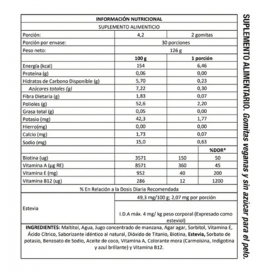 Uso no recomendado para menores de 8 años, embarazadas y nodrizas. Consulte con su médico. Este producto es un suplemento alimenticio y no reemplaza una alimentación balanceada. ¡Para resultados óptimos recomendamos complementar su consumo de estas gomitas junto a nuestros shampoo y tónico anticaída SHEET!